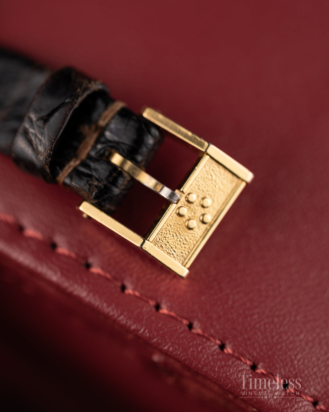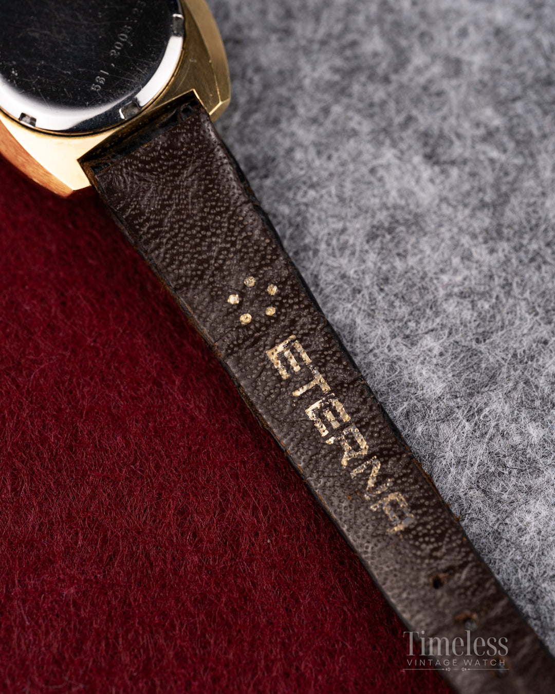 Vi presento questo raffinato Eterna Sahida, orologio svizzero automatico prodotto tra la fine degli anni '60 e i primi '70. Il quadrante champagne con finitura soleil con indici applicati e datario a ore 3 è incorniciato da una cassa a cuscino placcata oro dalle linee sinuose, che riflette la luce in modo caldo e delicato. Il tutto si completa con un vetro originale con logo in rilievo (foto n.7) , cinturino e fibbia originali Eterna, elementi che ne preservano l'autenticità e il valore collezionistico.