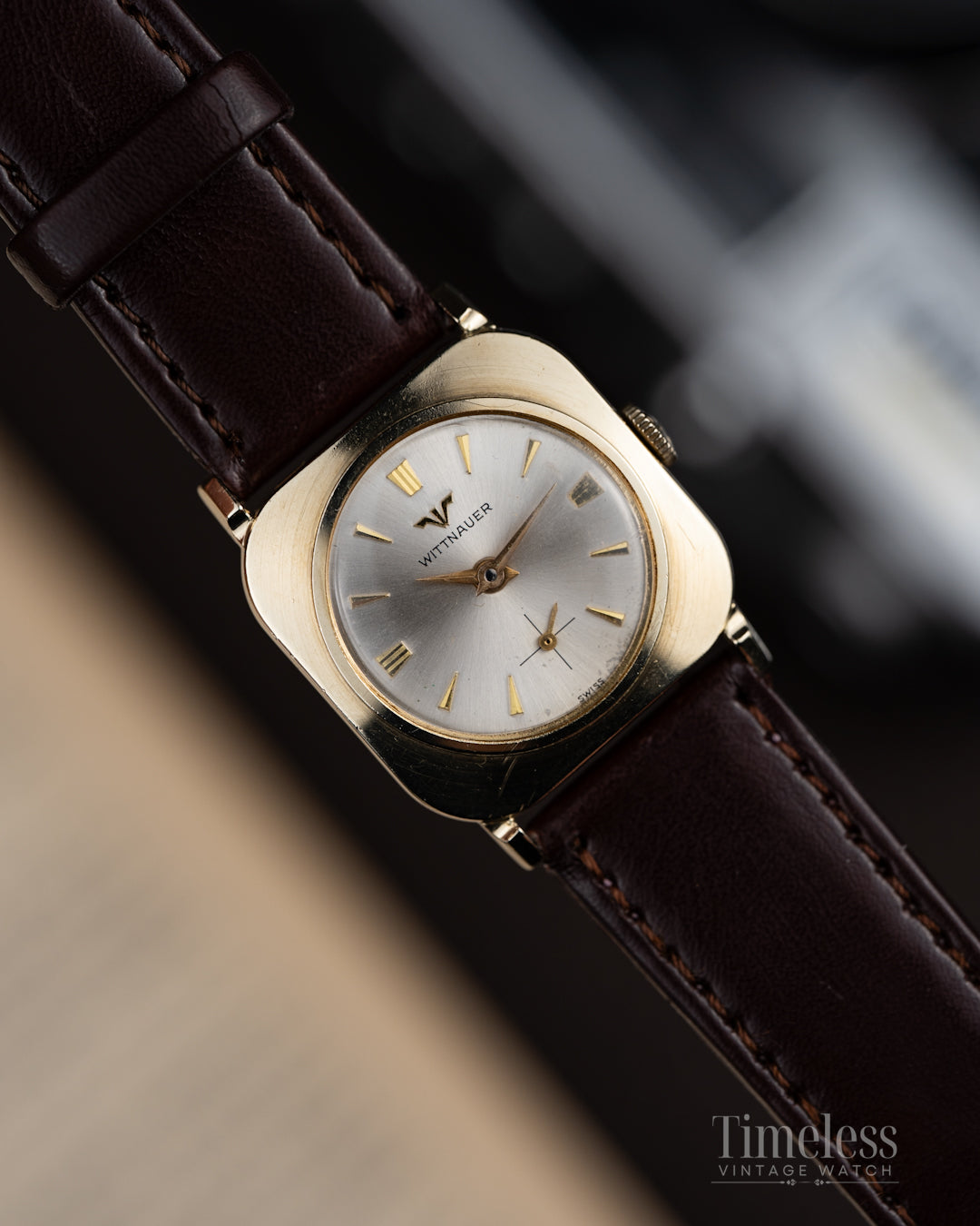 Questo Wittnauer anni 50’ nasce dall’eredità della maison Wittnauer, fondata a New York nel 1885 con l’ambizione di portare la precisione svizzera al polso dell’America. La sua cassa cushion placcata oro custodisce un quadrante argento delicatamente patinato, con indici applicati e piccoli secondi a ore 6.