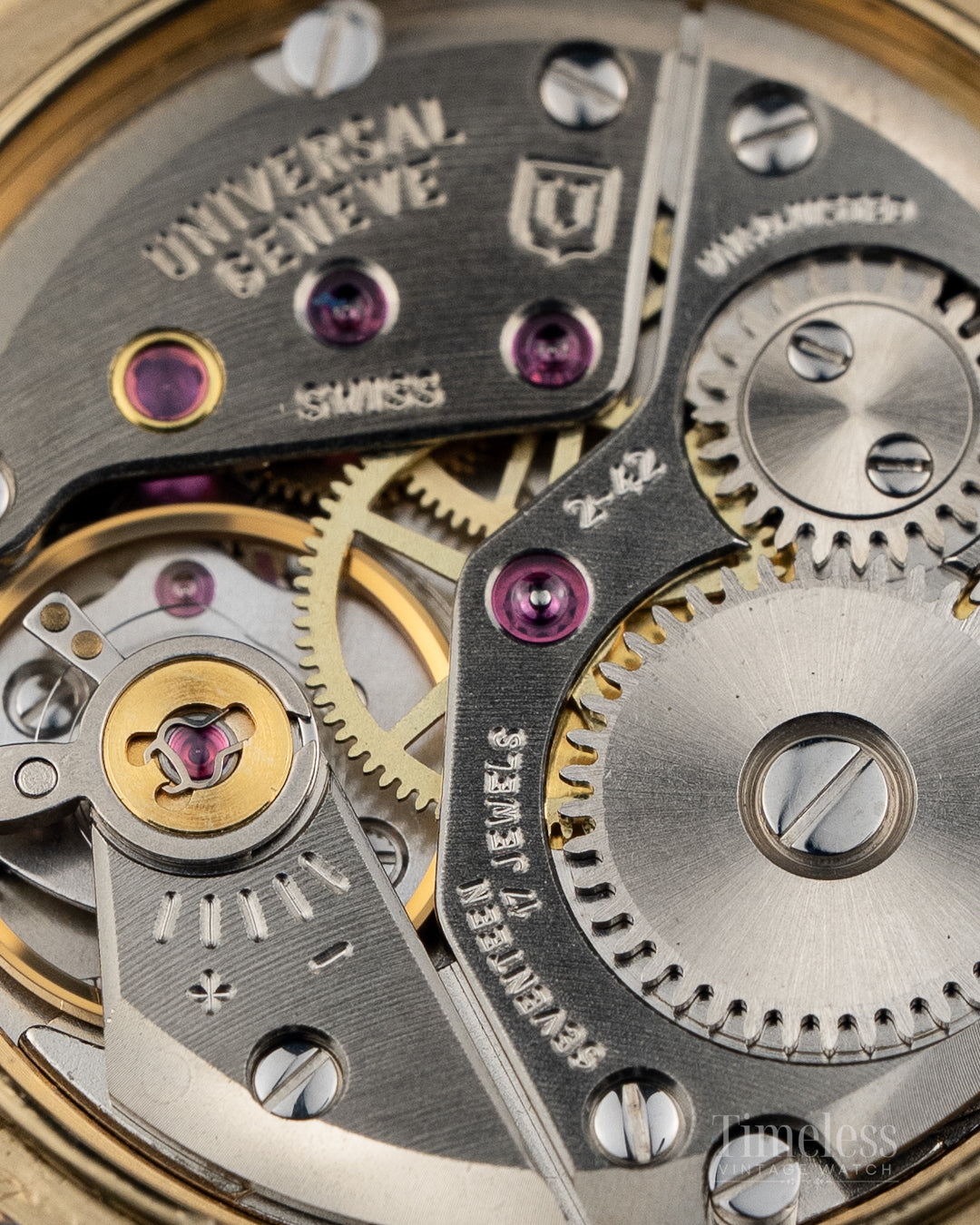 - Movimento: Universal Genève 2-42 a carica manuale, 17 rubini e 21600 A/h